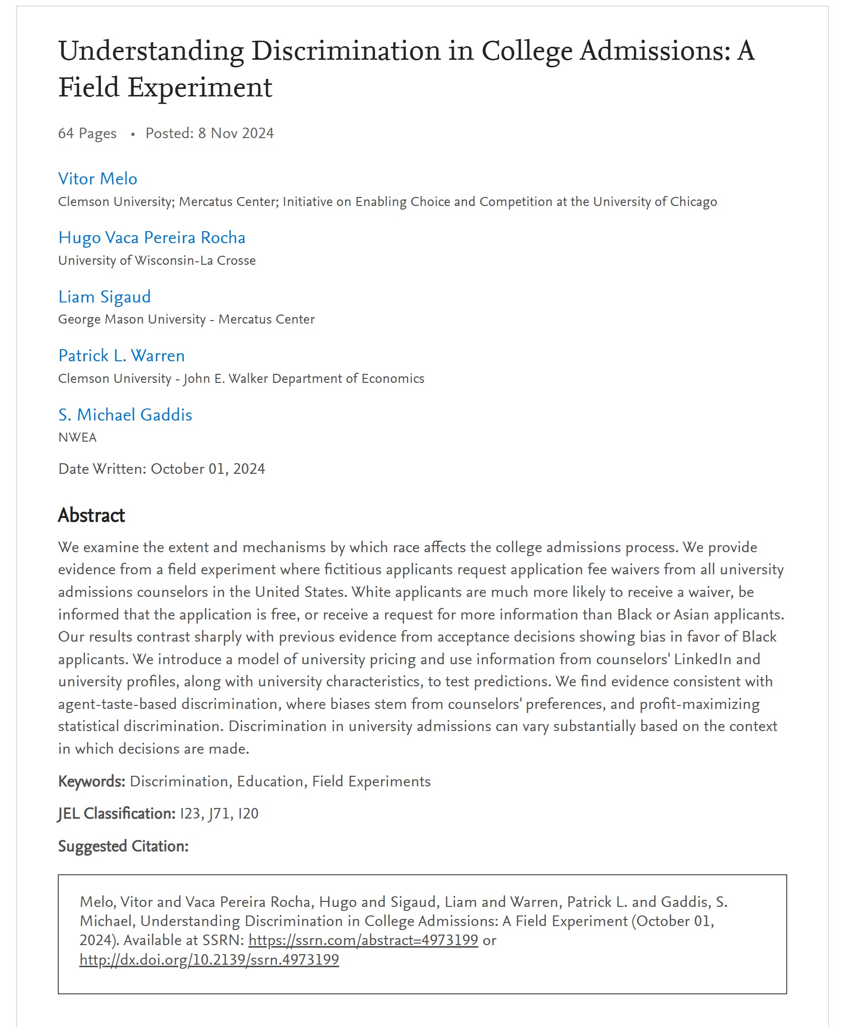 We examine the extent and mechanisms by which race affects the college admissions process. We provide evidence from a field experiment where fictitious applicants request application fee waivers from all university admissions counselors in the United States. White applicants are much more likely to receive a waiver, be informed that the application is free, or receive a request for more information than Black or Asian applicants. Our results contrast sharply with previous evidence from acceptance decisions showing bias in favor of Black applicants. We introduce a model of university pricing and use information from counselors’ LinkedIn and university profiles, along with university characteristics, to test predictions. We find evidence consistent with agent-taste-based discrimination, where biases stem from counselors’ preferences, and profit-maximizing statistical discrimination. Discrimination in university admissions can vary substantially based on the context in which decisions are made.